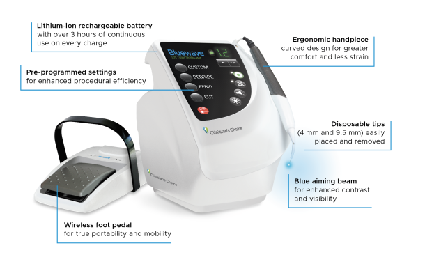 With its compact size and wireless foot pedal, the Bluewave offers true lightweight portability, while its robust lithium-ion rechargeable battery allows for over 3 hours of continuous use on every charge.
