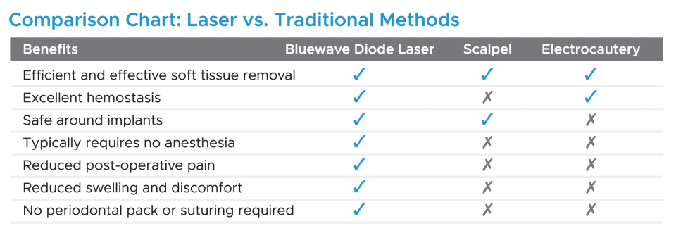 With enhanced procedural efficiency, the versatile Bluewave Soft Tissue Diode Laser is ready for any restorative or periodontal indication and boasts 5W of power and three pre-programmed settings (debride, perio, and cut).
