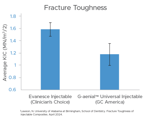 Achieves greater fracture toughness than the leading injectable composite1, while maintaining non-slumping, stackable handling properties required for injection molding placement.
